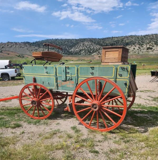 This was the last dray wagon to be used for hauling freight in Butte, MT. It has been in the family since the 1950’s. This wagon has been gone through with the wood and wheels being redone. It has been on many wagon trains and parades. It has always been stored inside.