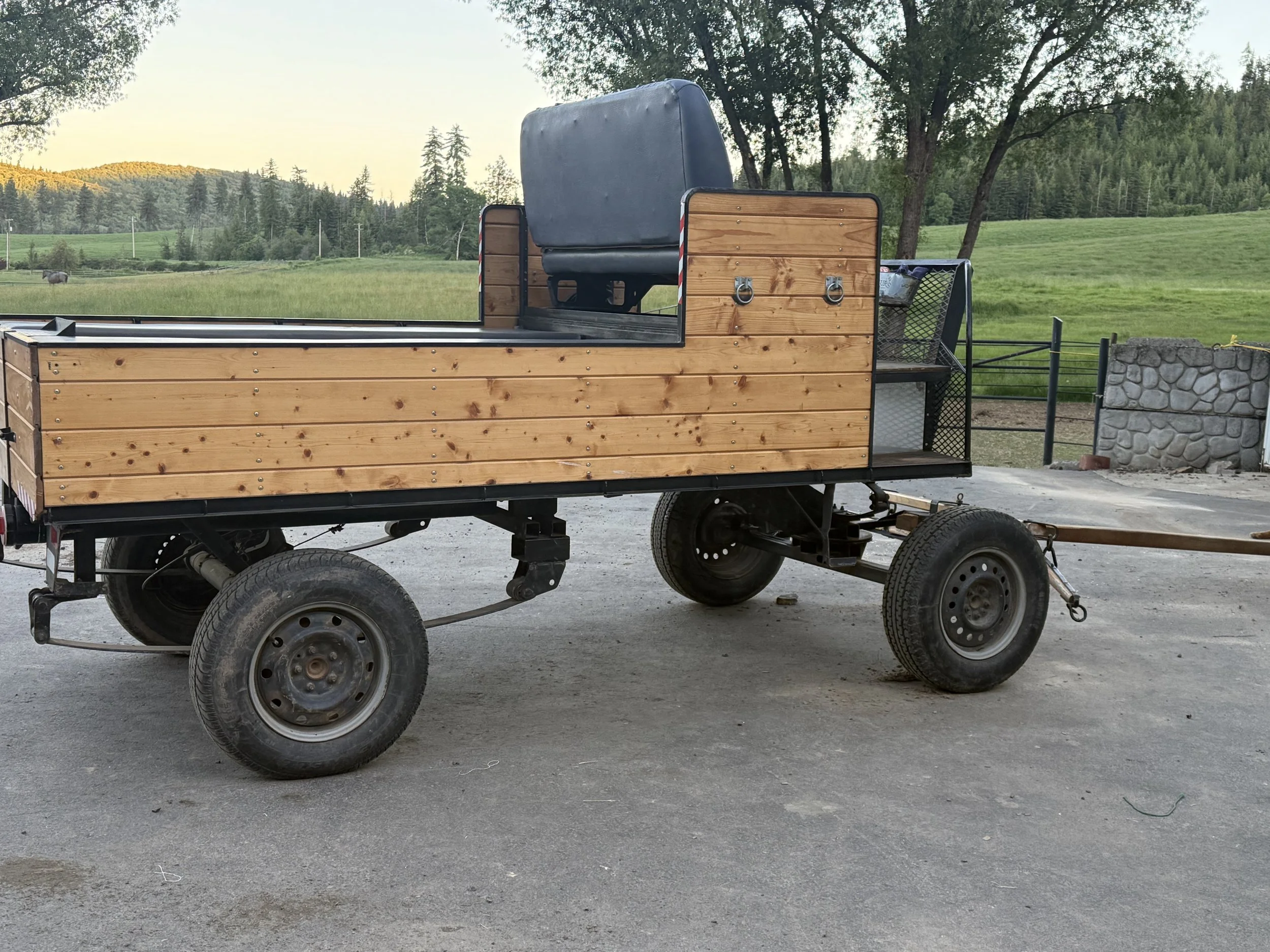 Custom made, rubber tired wagon on a Volkswagen undercarriage. Lots of seating and storage in rear. Custom electric fencing storage under wagon bed, with back-up camera. 72" wide and 124" long.