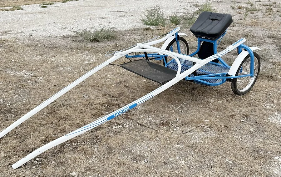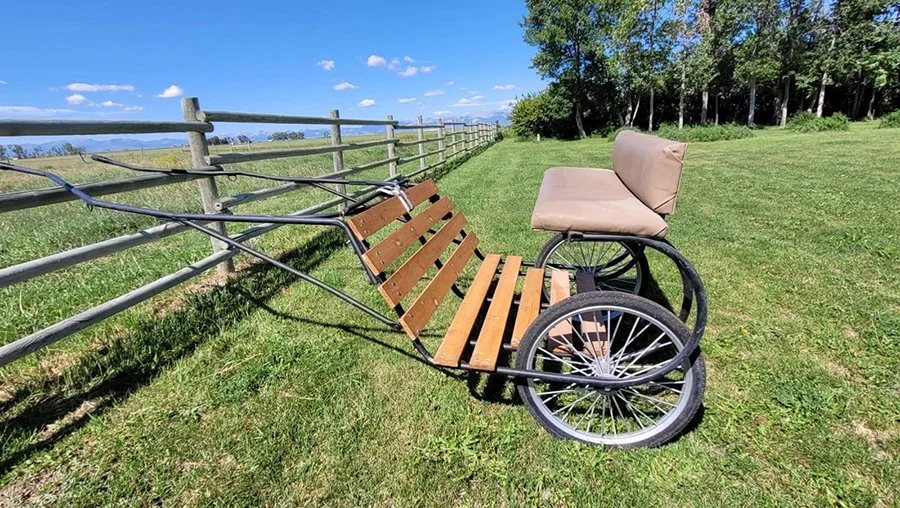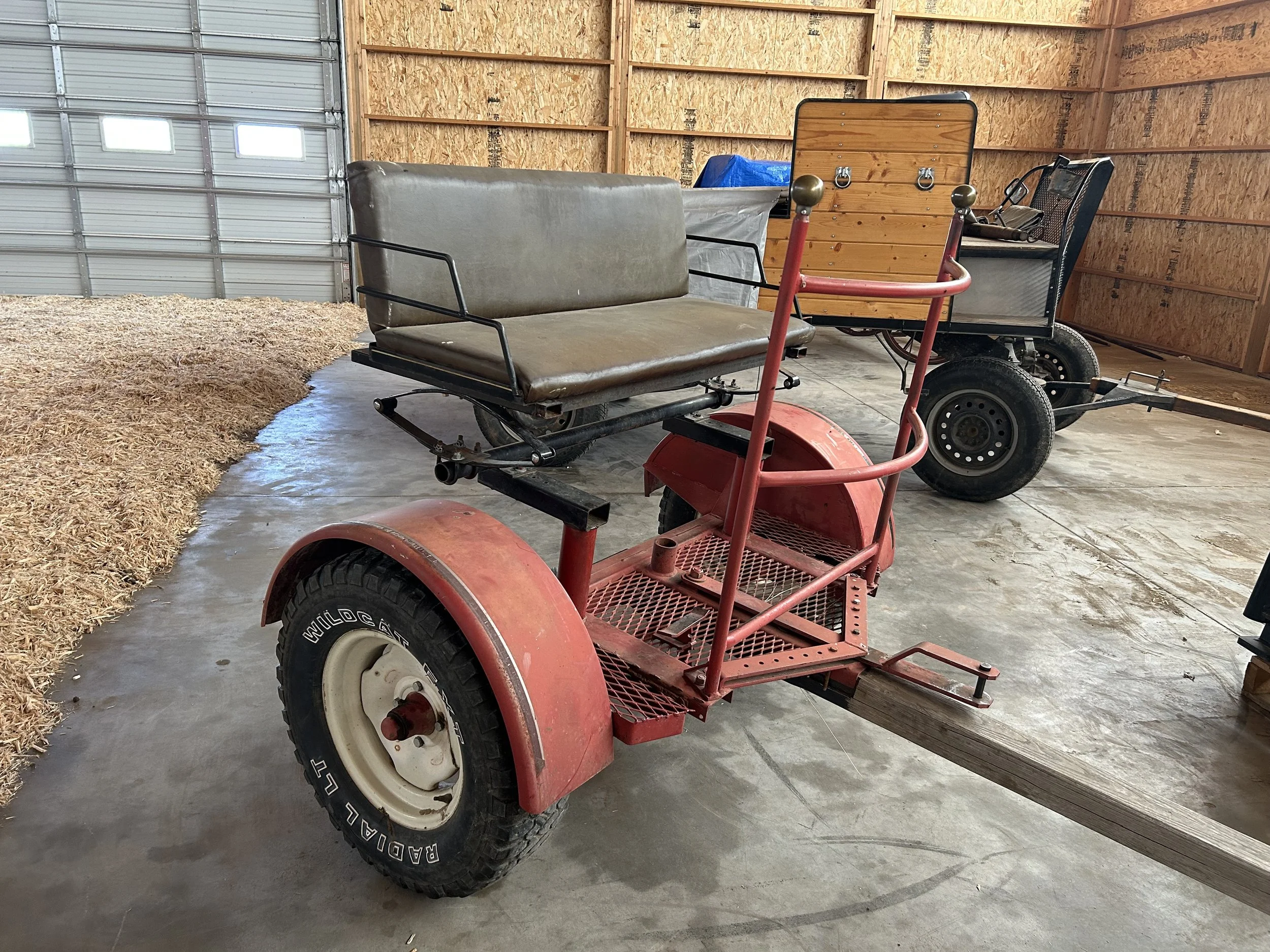 24” airless wheels, easy entry. Used on a 14hh horse. Not fancy but a good, solid using cart.