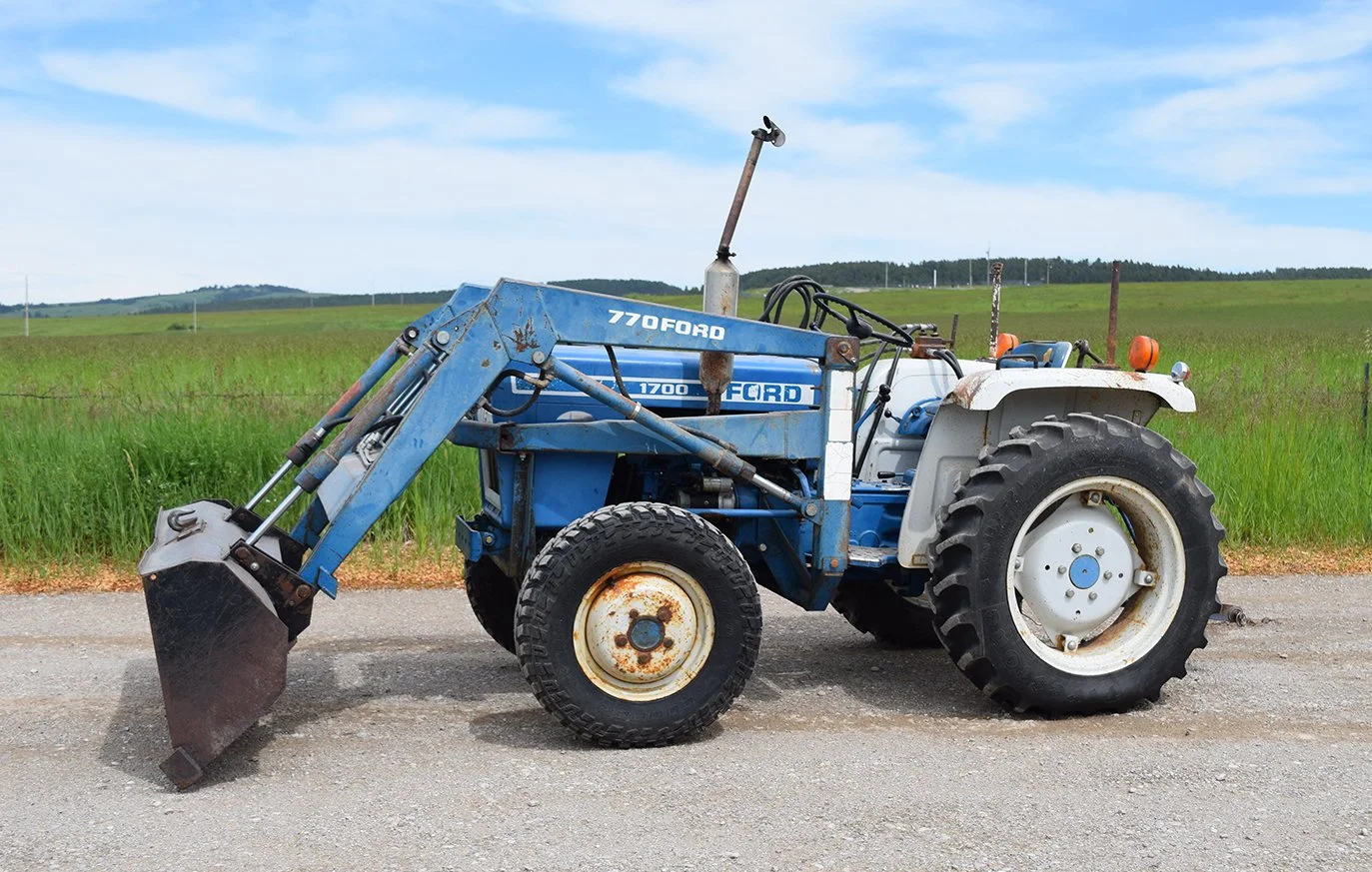Ford 1700 with For 770 loader with 4’ bucket, like new rubber all around, Diesel, 4WD, pto, approx 25hp.