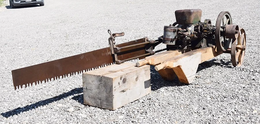 There once was a time when wood was the only source of fuel available to farm families across the United States. The job of putting away enough wood for the winter was a TASK! Farm families were constantly striving to find labor-saving methods for performing their farm work. In answer to this need, the Ottawa Manufacturing Company, of Ottawa, Kansas, developed the Ottawa crosscut log saw. The saw was outfitted with a two and a half or a four horse-power, single-cylinder Ottawa “hit and miss” stationary power unit. Mounted on two wheels with a frame attached to long handles, the operator would simply use the handles of the Ottawa saw to move the entire unit, just like a wheel barrel or a two-wheeled cart, to a log lying on the ground, rather than requiring the operator to drag the log to the saw. Securing the handles on the log at the proper location by the use of cant hooks, the operator would position the blade of the saw to cut off a piece of the log to the desired length. Next, the operator would turn the wheels of the saw 90 degrees from the transport position to a position parallel to the log. Then the engine would be engaged, the blade would start moving, and the operator only had to stand back and watch. The flywheel and pitman of the “hit and miss” engine would push and pull the saw blade back and forth across the log at a rate of up to 140 to 170 strokes per minute. This certainly was an improvement over crosscutting the entire winter’s supply of wood by hand.