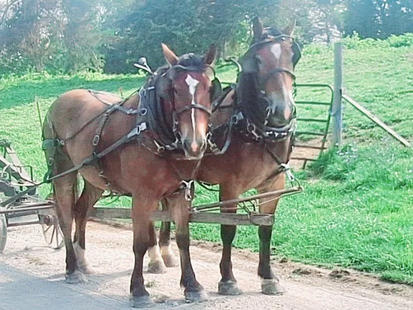 Percheron x Morgan - 16:0/16:0hhSue and Peggy are a well-matched pair of Percheron x Morgan mares that we purchased from Reuben Miller 6 years ago. They are a great team that stand quietly to harness and hitch. They are good with their feet. We will say that they are a “heads up go team”. They enjoy working and are always ready. We consider them more of a coach team. Both mares are wonderful mothers. Both were pasture bred to a buckskin Quarter Horse stallion. Both have had buckskin babies in the past being bred this exact same way. Consigned by Boone Jones.
