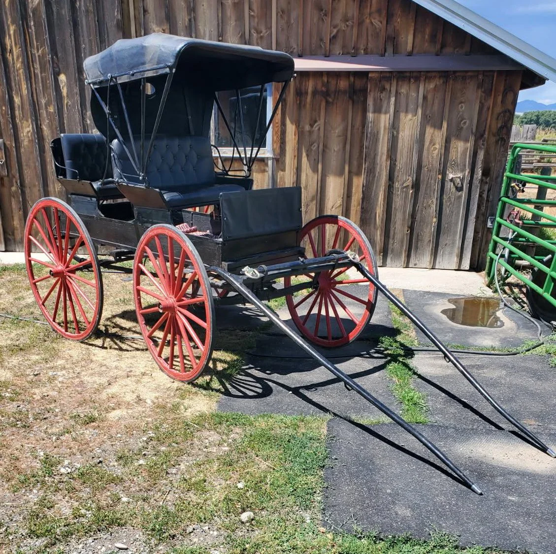 A nice little four wheeled, two person carriage that is pulled by one horse. Very Nice!!