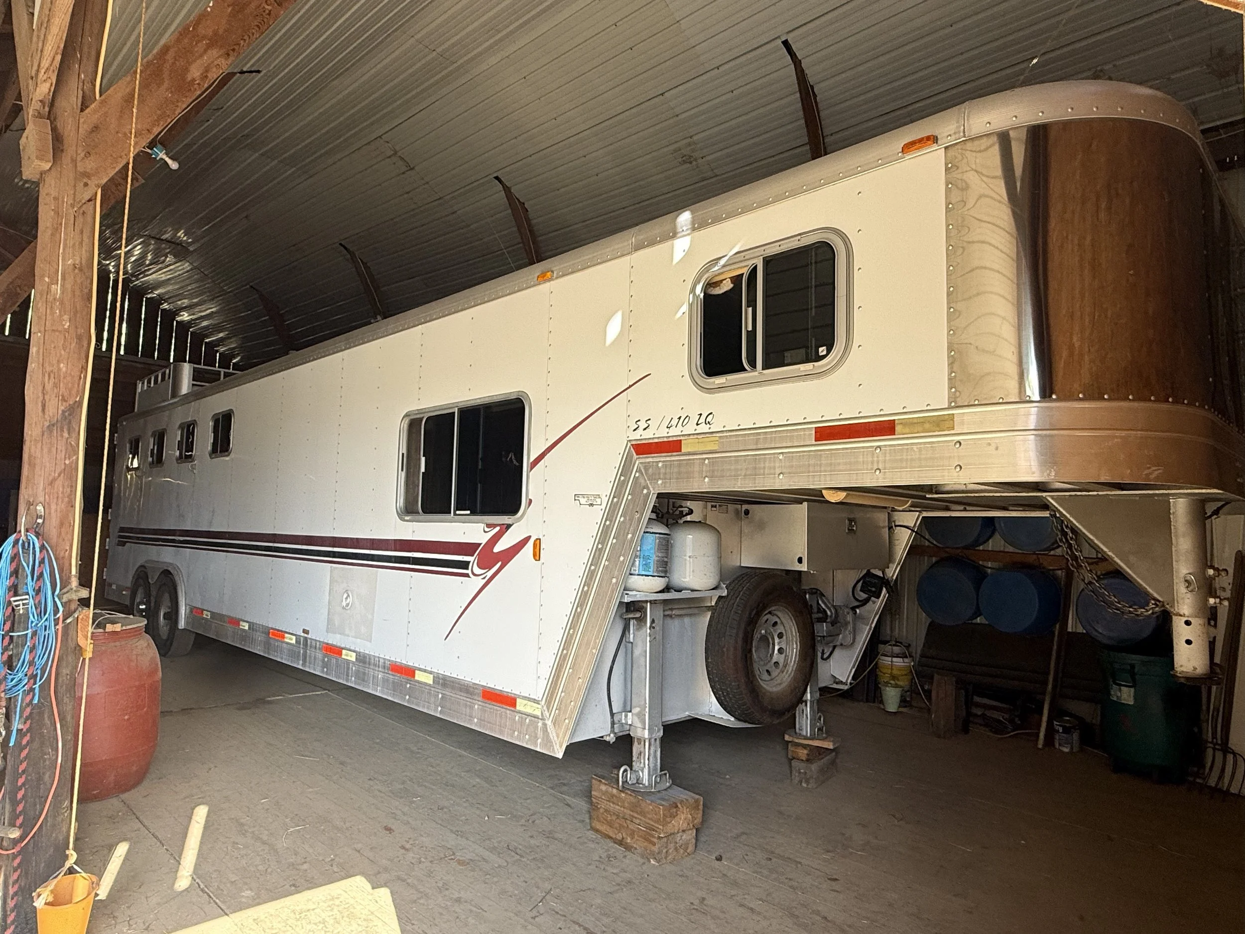 2001 Exiss, 4-horse, goose neck trailer with living quarters. 36' long, 8' wide, 7’1” tall. Includes removable water tank, saddle rack, and Honda generator.